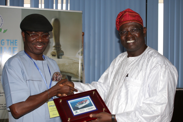 | Ag Director General,NIMASA, M Haruna Baba Jauro (right), presenting a plaque to the Leader of the South South Media Professionals, Mr Asu Beks during a courtesy visit to the Agency recently. |