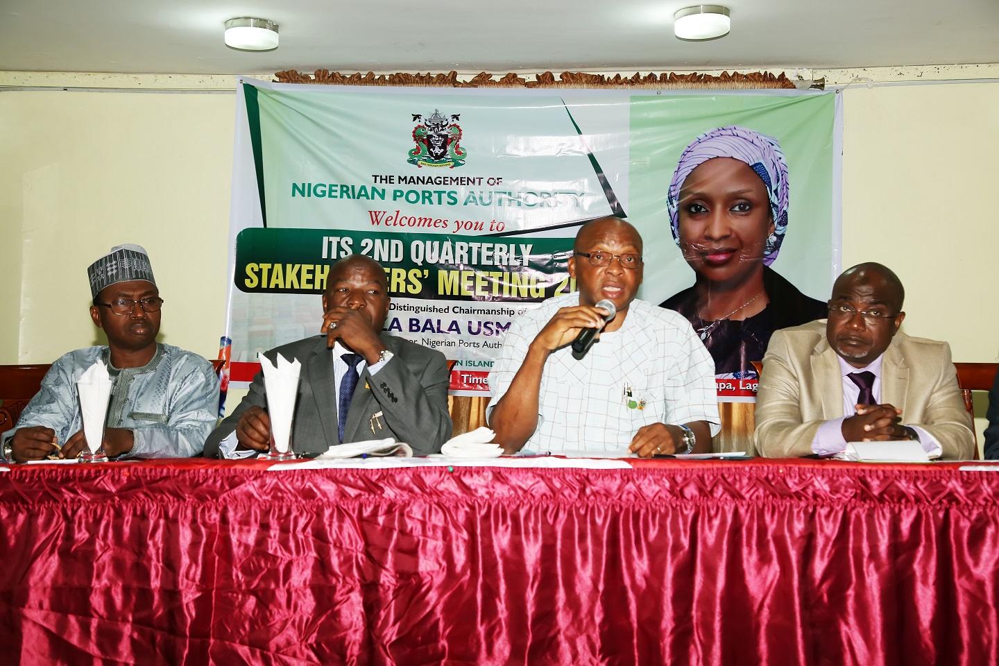 Rep of the Managing Director of Nigerian Ports Authority (NPA), the Executive Director, Marine & Operations, Dr. Sokonte Huttin Davies (2nd Right); the General Manager Engineering, Ahmed Rufai Mohammed (Right); the General Manager, Corporate & Strategic Communications, Abdullahi Goje (2nd Left) and the General Manager, Security, Mohammed Anas (Left) during the NPA Management Meeting with Stakeholders in Apapa, Lagos.