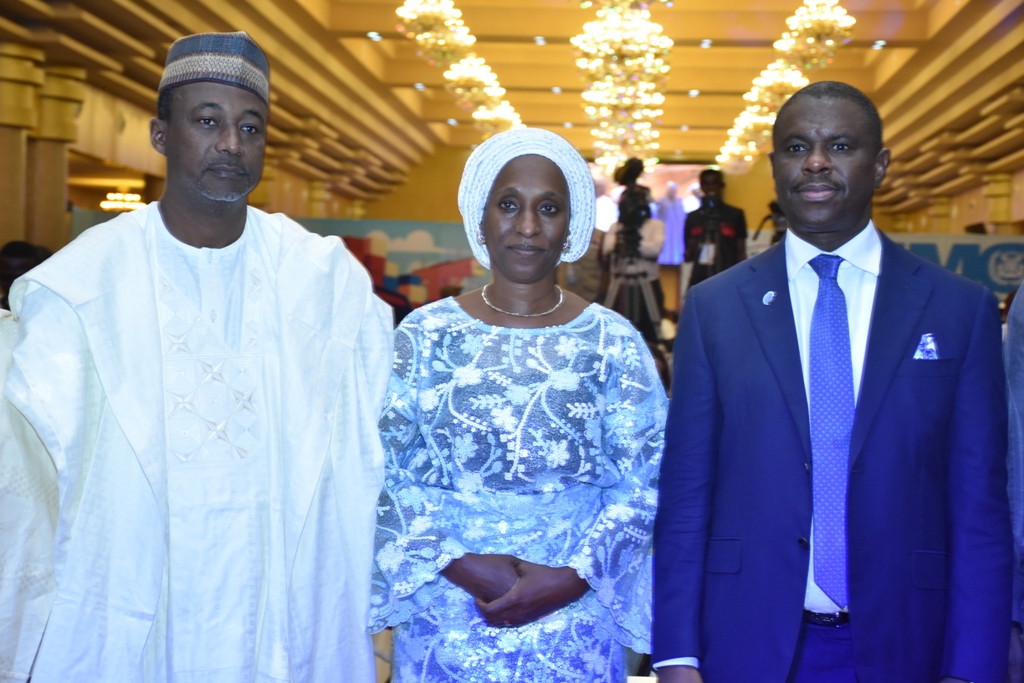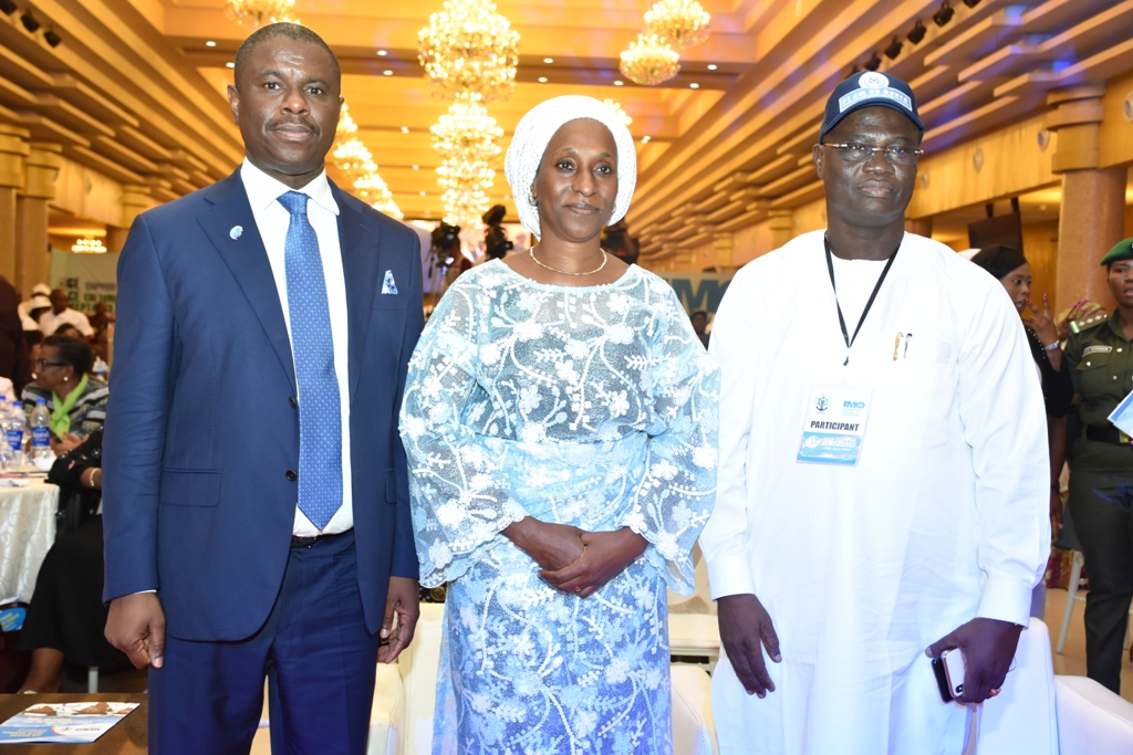 L-R: Director General, Nigerian Maritime Administration and Safety Agency (NIMASA), Dr. Dakuku Peterside; Wife of the Vice President, Federal Republic of Nigeria, Mrs. Dolapo Osinbajo; President General, Maritime Workers Union of Nigeria (MWUN) Comrade Adewale Adeyanju during the celebration of the 2019 Day of the Seafarer held in Lagos.