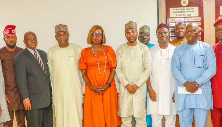 The Managing Director, Nigerian Ports Authority (NPA), Mohammed Bello Koko (8th left), Executive Director, Marine & Operations, Adenrele S. Adesina (7th left), National President, NARTO, Alh. Yusuf Lawal Othman (6th left), President General, MWUN, Comrade Adewale Adeyanju (7th left) and executives of both NARTO and MWUN after a meeting with NPA Management in Lagos.