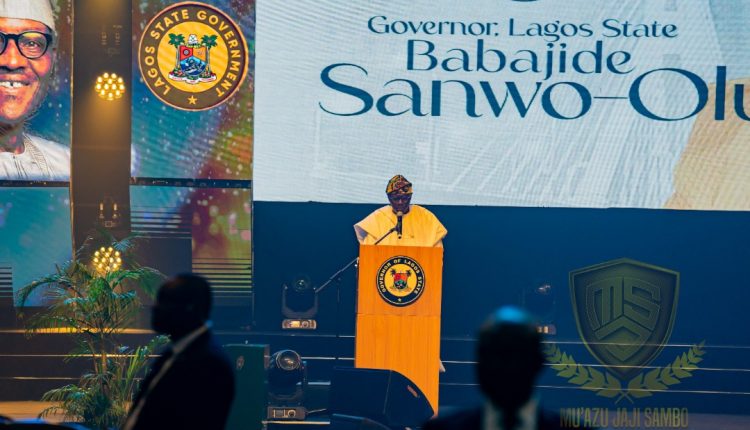 L-R: President Muhammadu Buhari, Governor Babajide Sanwo-Olu and his wife Ibijoke Sanwo-Olu at the banquet.