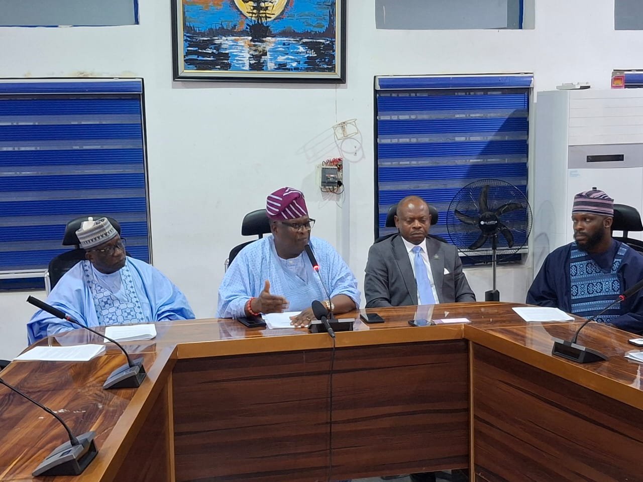 Chairman of the Maritime Academy of Nigeria Governing Council, Engr. Kehinde Akinola (Middle) speaking at the news briefing in the Academy.