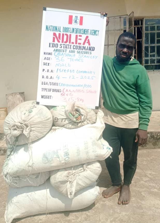 In another raid on December 4, 2025, NDLEA operatives acting on intelligence arrested Mr. Stanley Obasuwa, aged 36, at a warehouse located in the Isiefve community, Uhunwonde LGA, Edo State. The raid yielded the seizure of eight bags of cannabis sativa seeds weighing a total of 315.8 kilograms, stored in a simple structure on the outskirts of the community. The total weight of cannabis and seeds seized in the two operations now stands at an impressive 763.3 kilograms. Investigations are ongoing as operatives continue to track other suspects and dismantle drug networks operating within Edo State.